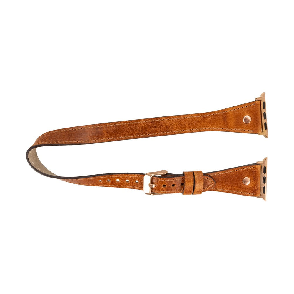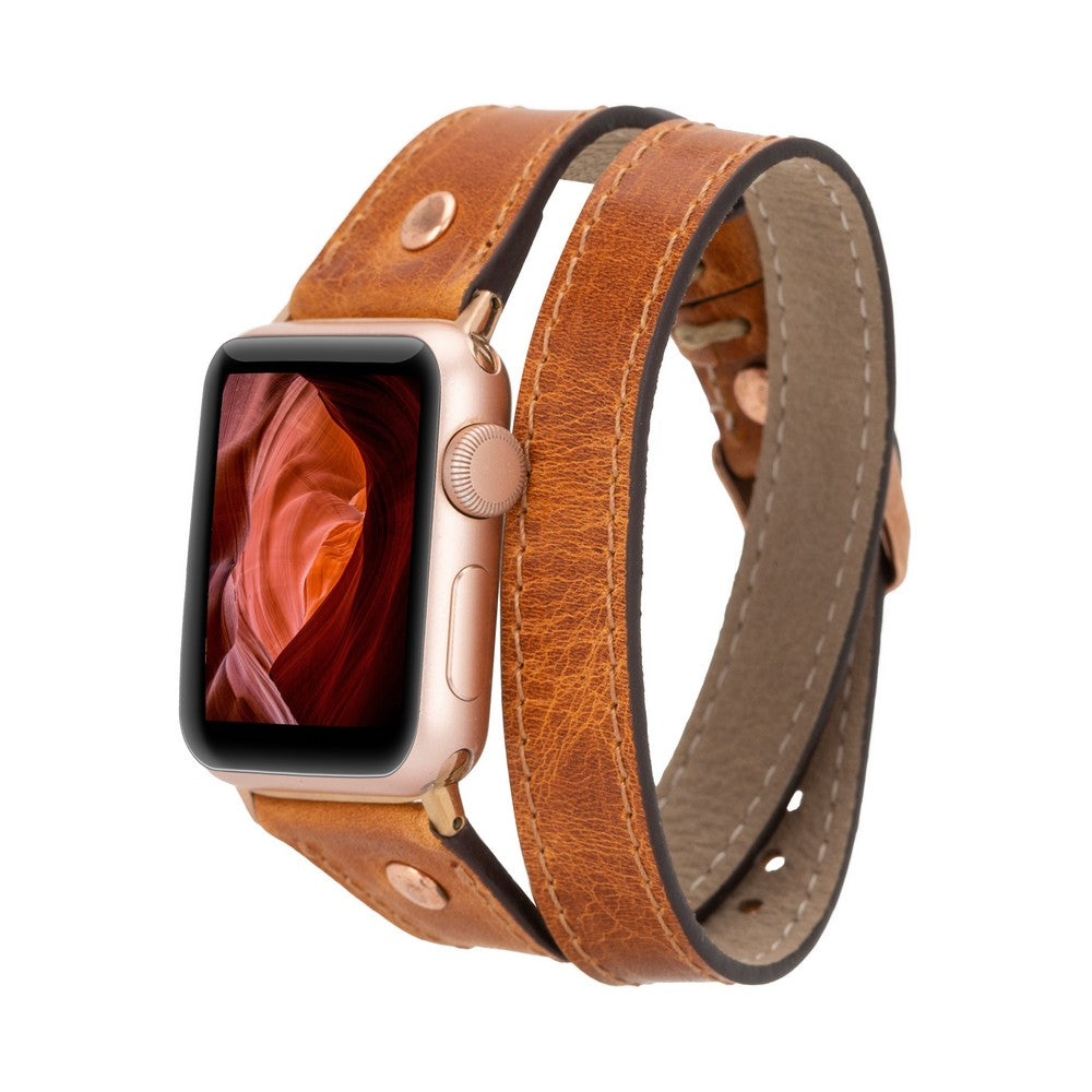 Apple Watch Uyumlu Deri Kordon, Çift Tur, Trok Detaylı, Antik Taba